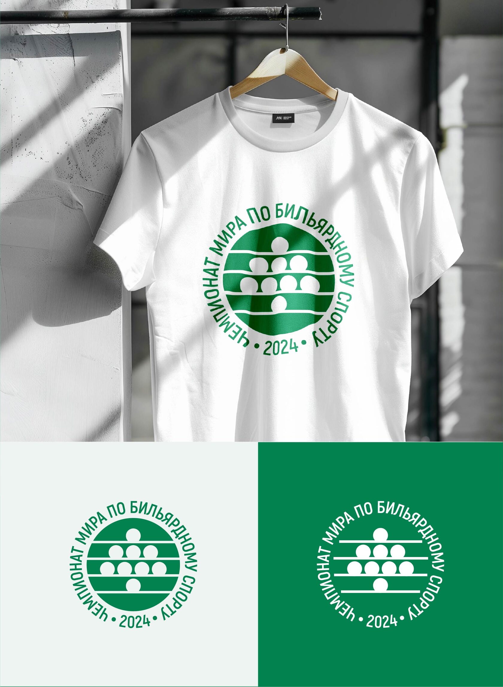 Инверсное и прямое решение для знака: слева — знак чемпионата мира по бильярдному спорту на белом фоне, справа — адаптация символа мероприятия для цветного фона.