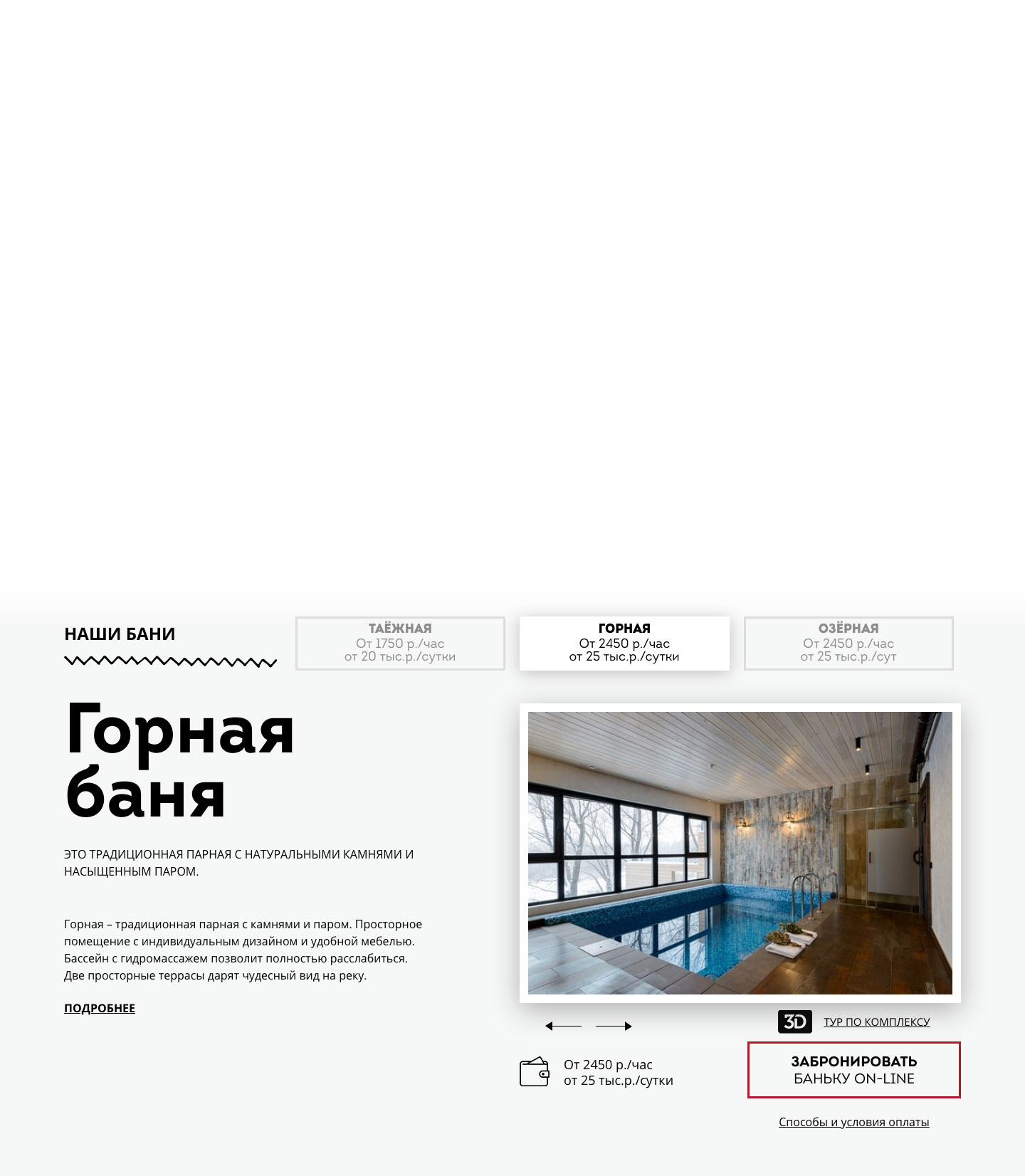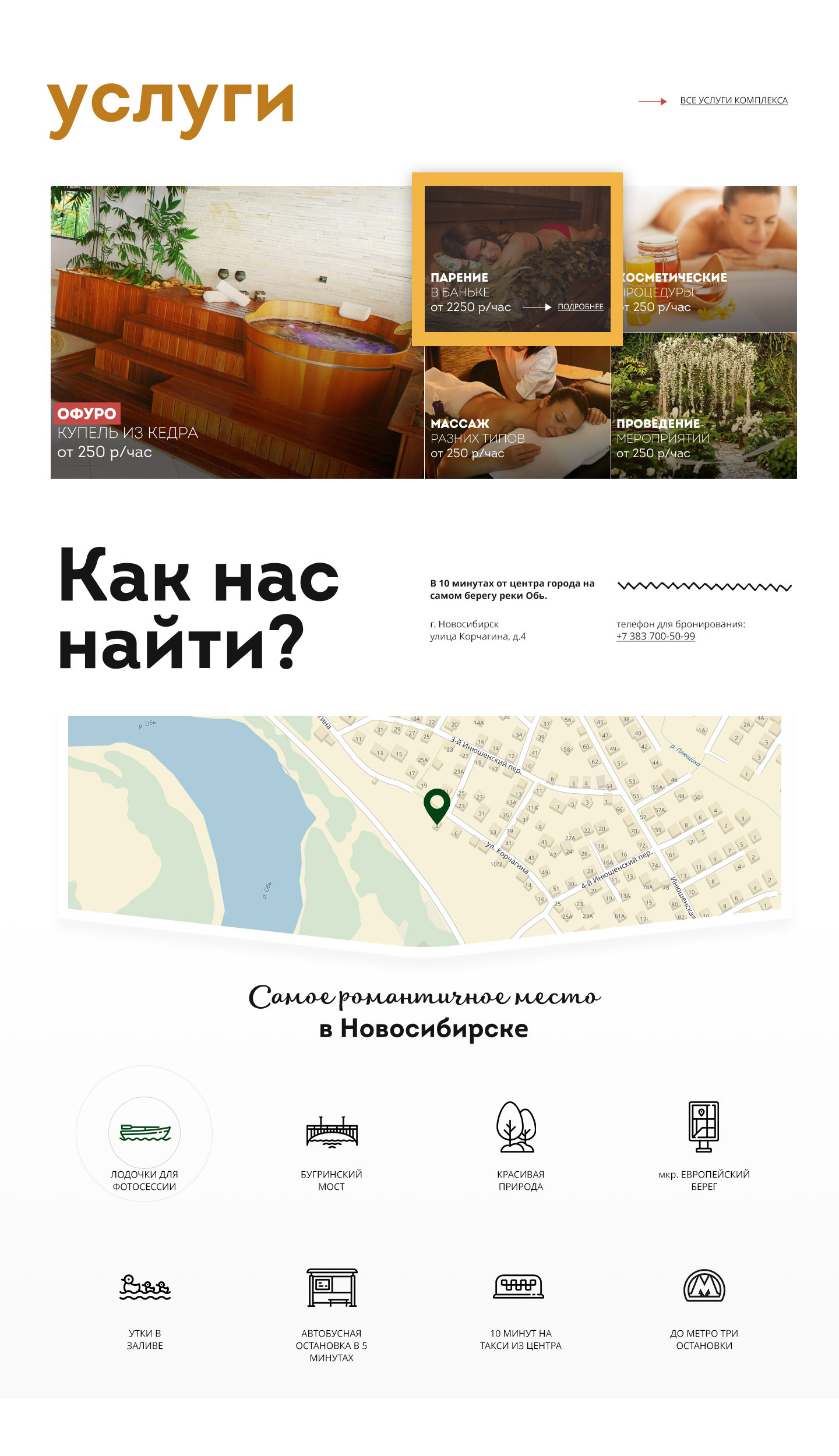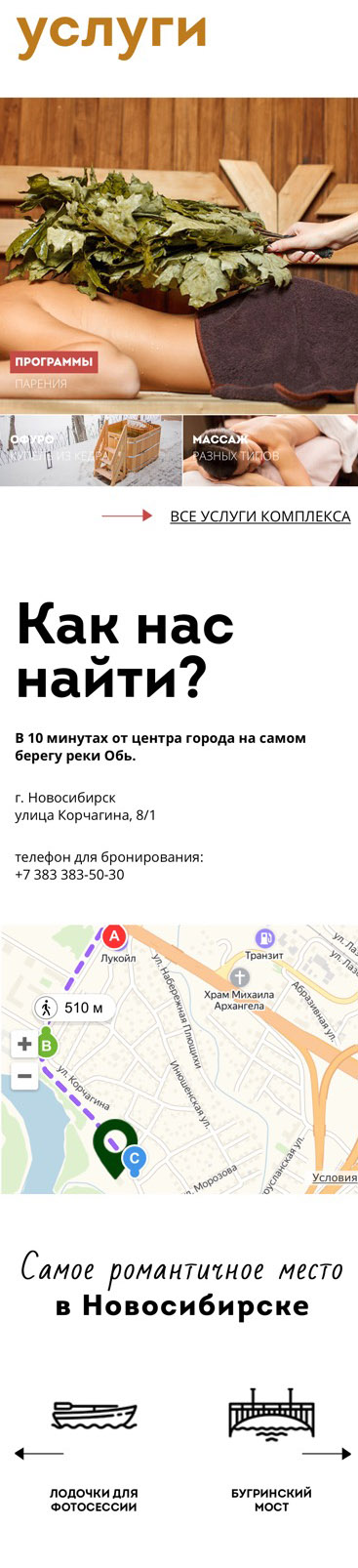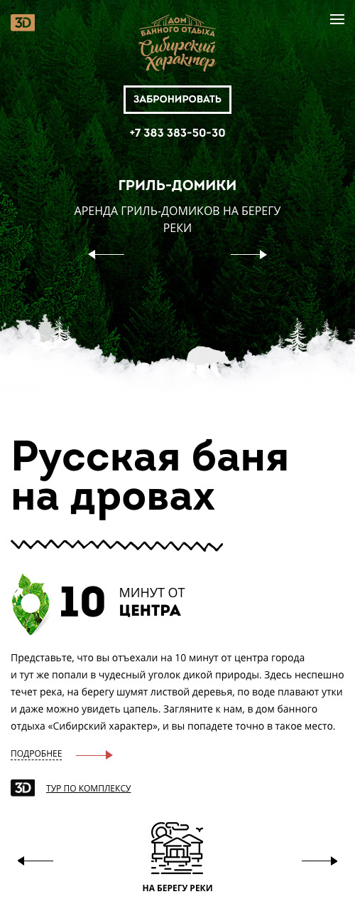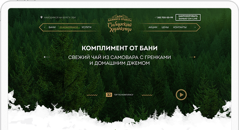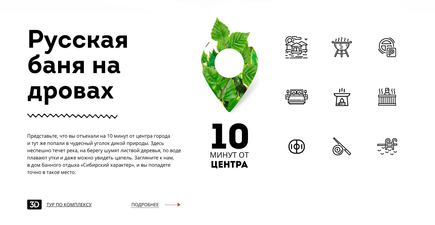 Второй экран веб-сайта — преимущества бань и саун «Сибирский характер». Мы нашли интересный графический приём — соединили символ места и банный веник из берёзовых листьев. Получился привлекательный глазу графический элемент — пин из березовых листочков. Мелочь, а создаёт на сайте приятное банное настроение.