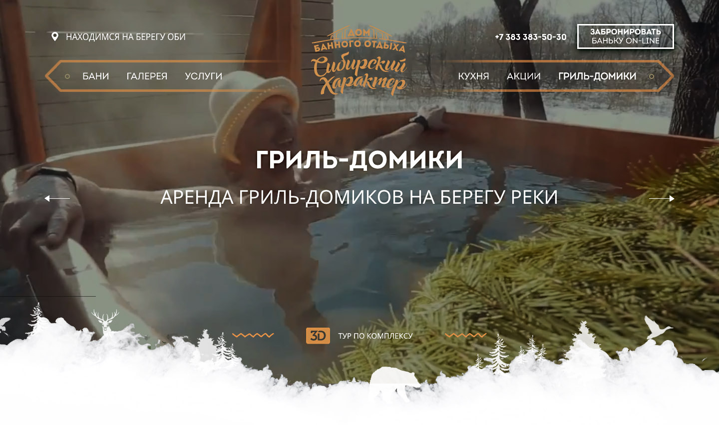 Главный экран веб-сайта «Сибирский характер» начинается с короткого рекламного ролика. Главный герой парится в бане, ныряет в бассейн и окунается в японскую купель офуро. Его парит веником здоровенный парильщик и массажирует настоящим березовым поленом.